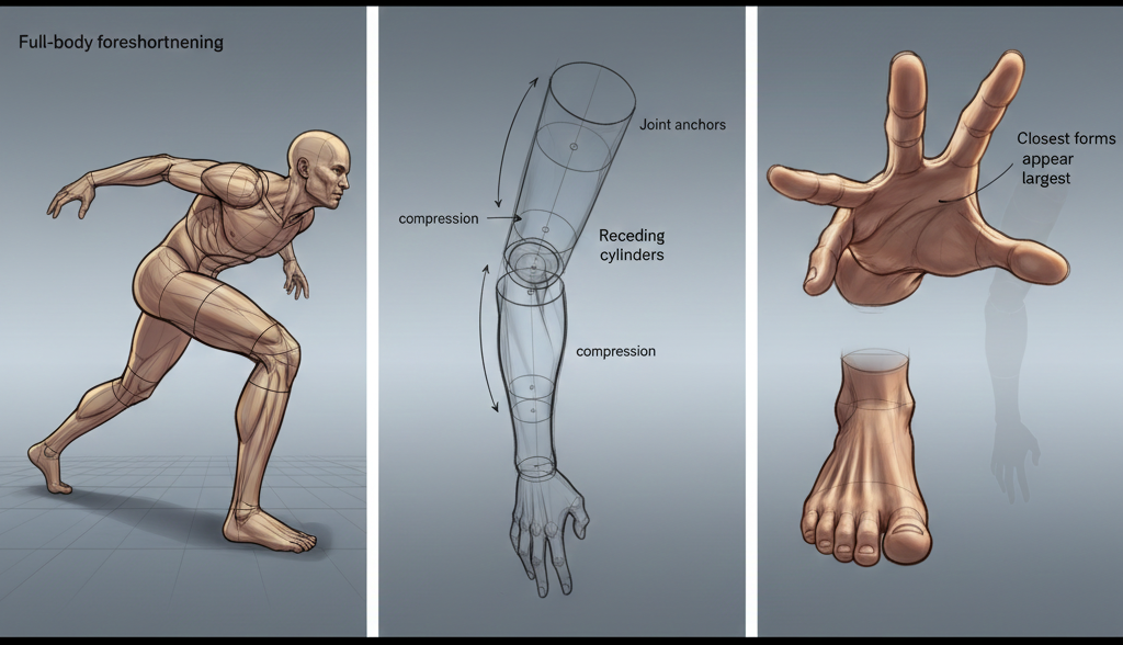 To see this yourself, try holding one arm straight out toward your face. Notice how your hand looks very large. Notice how your forearm and upper arm look squashed and short. That visual effect is what you must capture in your art. If you are struggling to plot these compressed dimensions, the foundational use of a grid drawing method can help. This method lets you accurately check the scale of each part against your reference.